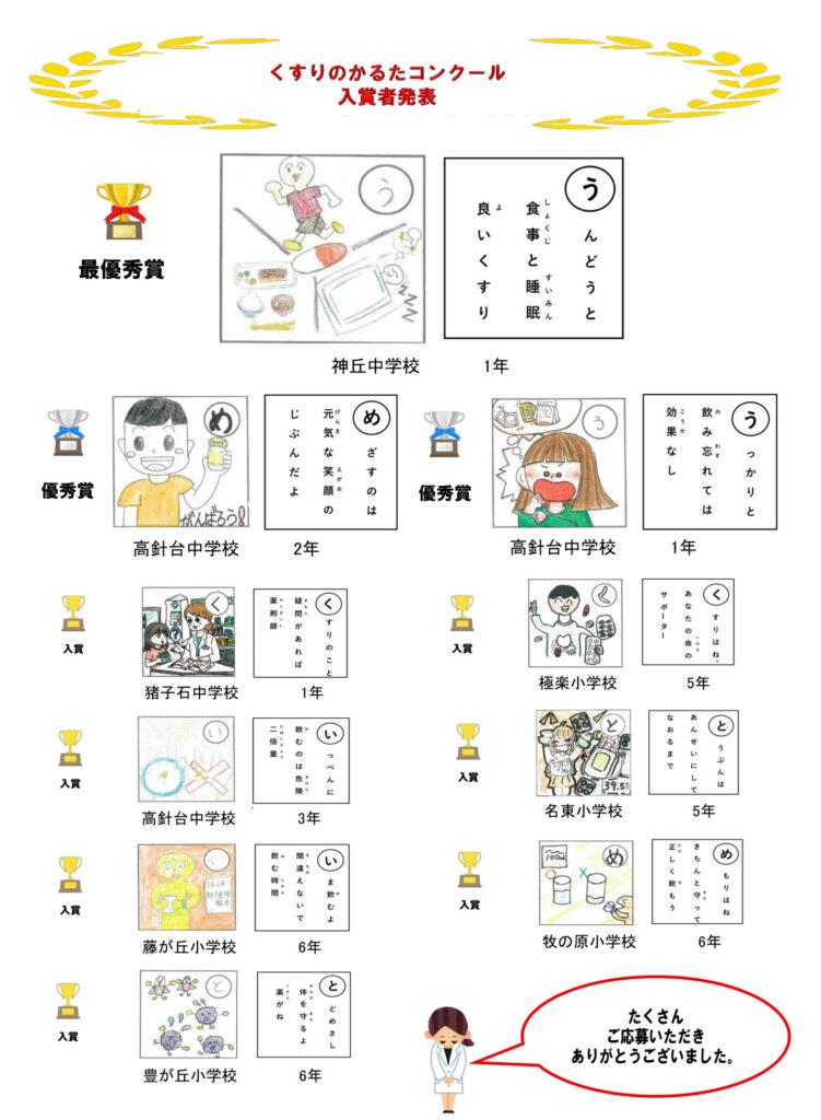沢山の応募作品の中から 、 厳正な審査の結果 、 最優秀賞 、 優秀賞 、 入賞作を選定いたしました 。 ご応募頂いた作品につきましては、学校や地域での講話やくすりの適正使用の普及 、 啓発の広報等に活用させていただきます 。